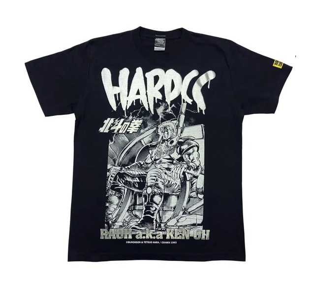 以下オフィシャルサイトよりコメント抜粋 日本漫画界の金字塔・北斗の拳! 1983年「週刊少年ジャンプ」で連載スタート。 その世紀末的な世界観とハードな残酷描写、個性豊かなキャラクター。 核戦争により文明社会が失われ、暴力が支配する世界となった世紀末を舞台に北斗神拳の伝承者・ケンシロウの愛と哀しみの闘いを描いたこの作品は、漫画のみならずTVアニメ、映画、ゲームなどでも展開、日本中に大ブームを呼んだ! ハードコアチョコレートで遂に実現した北斗の拳Tシャツは、徹底的な原作リスペクトなデザインを実現!その数、なんと6種! その中でもひと際インパクトの強い世紀末覇者拳王・ラオウをフロントに持ってきたのがこのTシャツ! バックプリントは山のフドウ、雲のジュウザ、炎のシュレン、風のヒューイ、海のリハクと南斗五車星全員が揃い踏み! 原作の息吹そのままにあの伝説的な戦いが蘇える!! 一歩踏み込んだ北斗の拳アパレルがここに誕生だ!! (Tシャツカラー:ネイビー プリントカラー:シルバー・ホワイト) S:着丈65cm×身幅49cm M:着丈69cm×身幅52cm L:着丈73cm×身幅55cm XL:着丈77cm×身幅58cm XXL:着丈81cm×身幅63cm