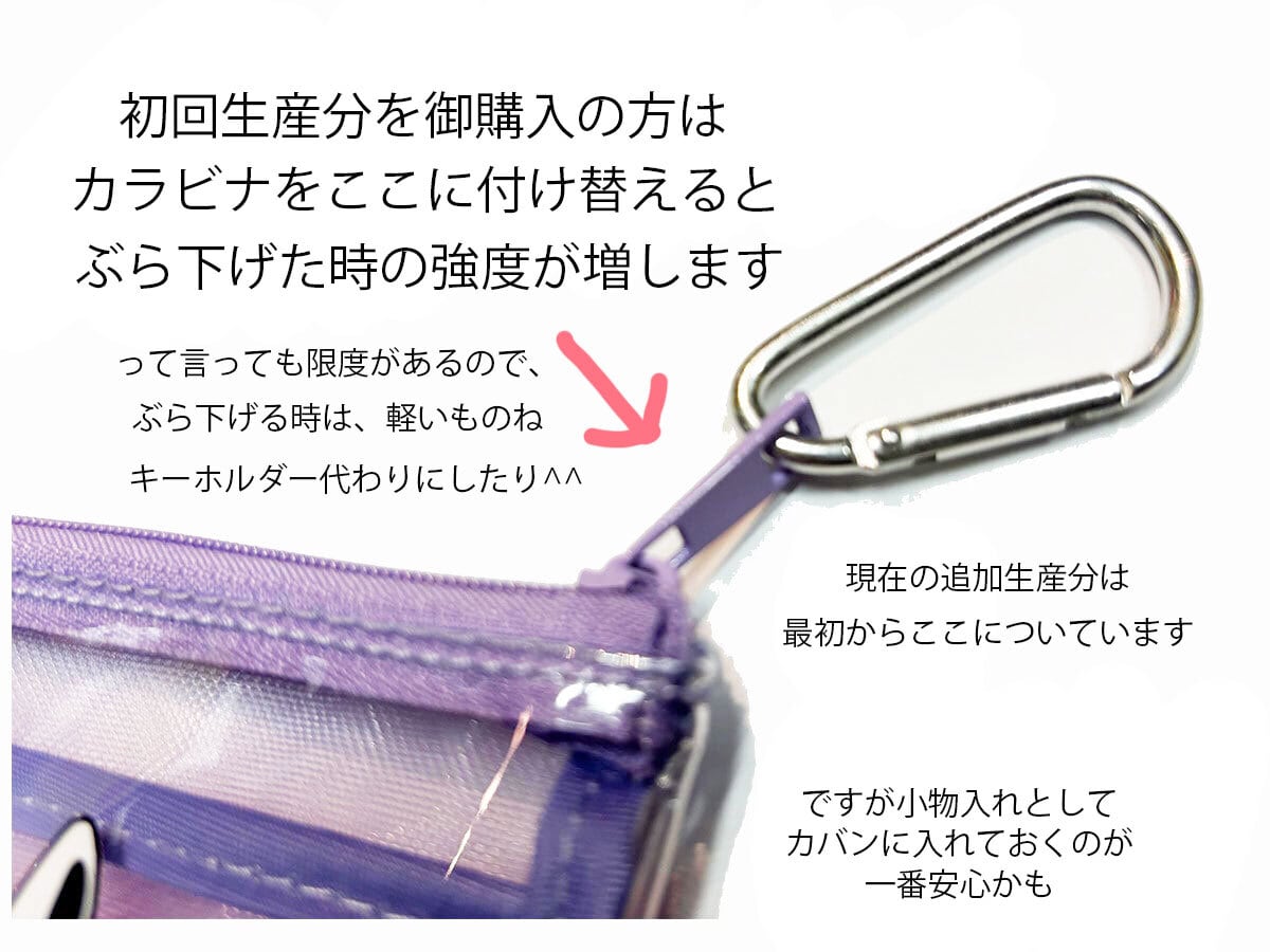 ※現在販売されている追加分は、最初からカラビナはフェスナー部分についていますが、初回生産分を既に御購入の方は、サイドについているので、キーホルダー代わりにぶら下げたい時は、カラビナをファスナー部分に付け替えると、ぶらさげた時に少し強度が増しすので、是非付け替えて御利用ください。